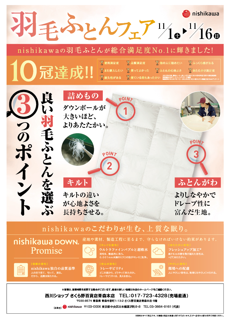 nishikawaの羽毛ふとんは総合満足度No.1!