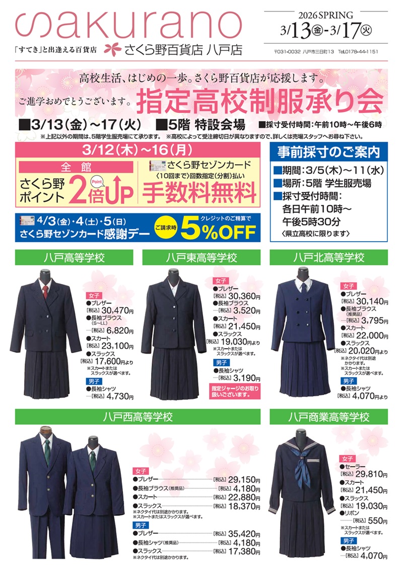 場所:5F/特設会場ご進学おめでとうございます。高校3年間の制服はさくら野がサポートいたします。