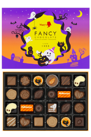 ハロウィンデザインの箱を開けると、にぎやかに並ぶチョコレートが登場!
