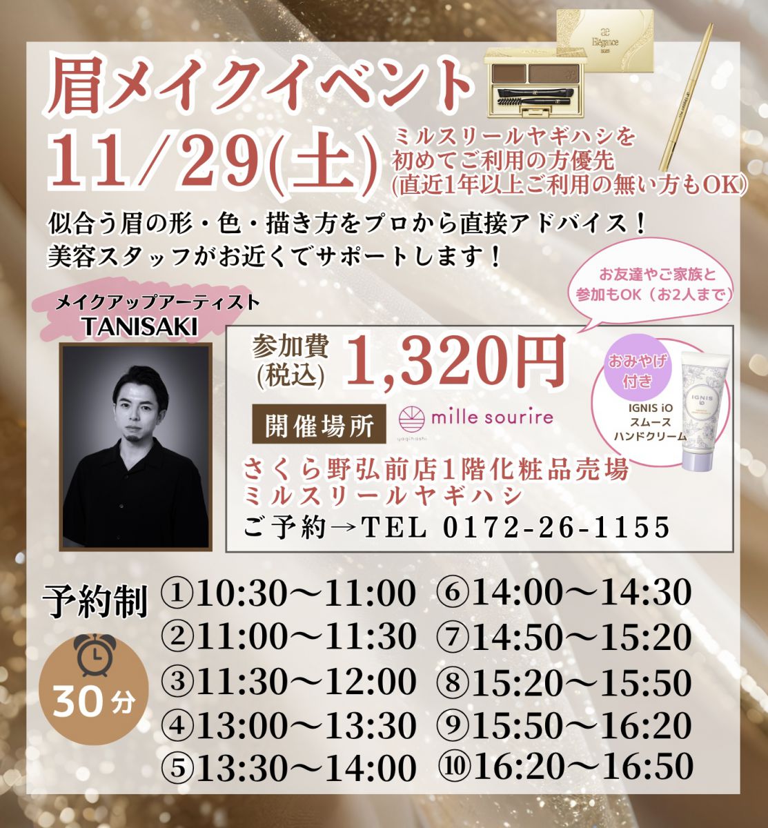 11/29(土)1階化粧品売場ミルスリールヤギハシにて、メイクイベント開催‼️