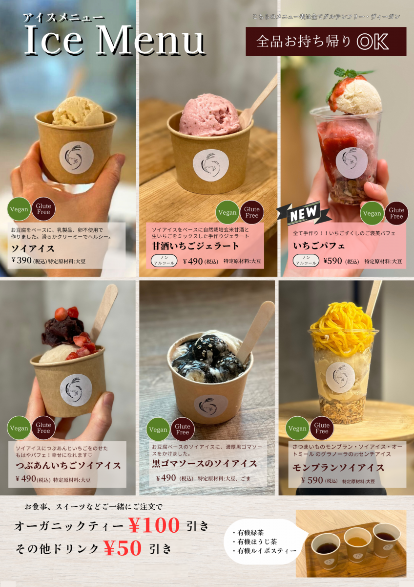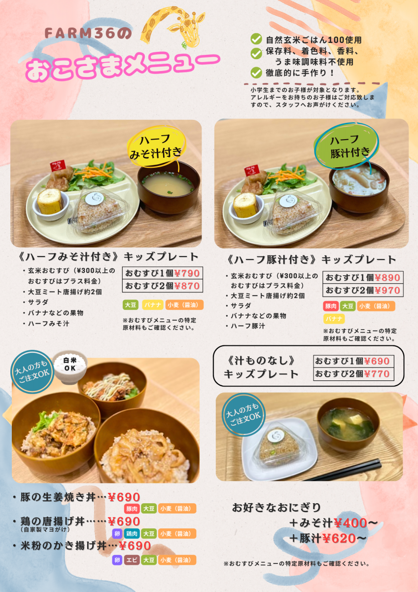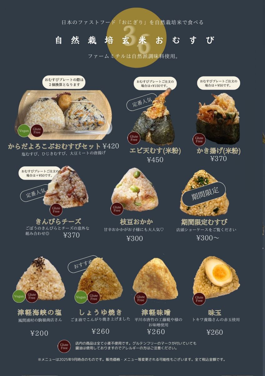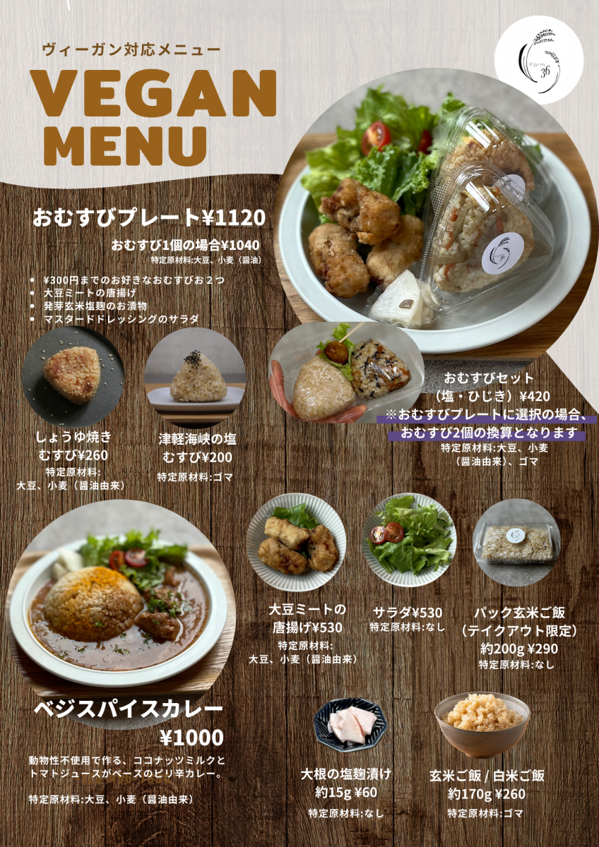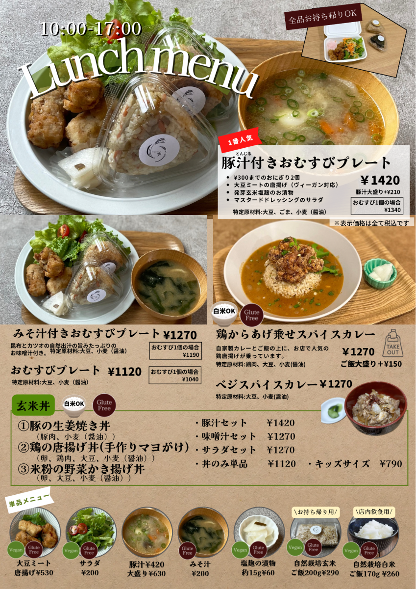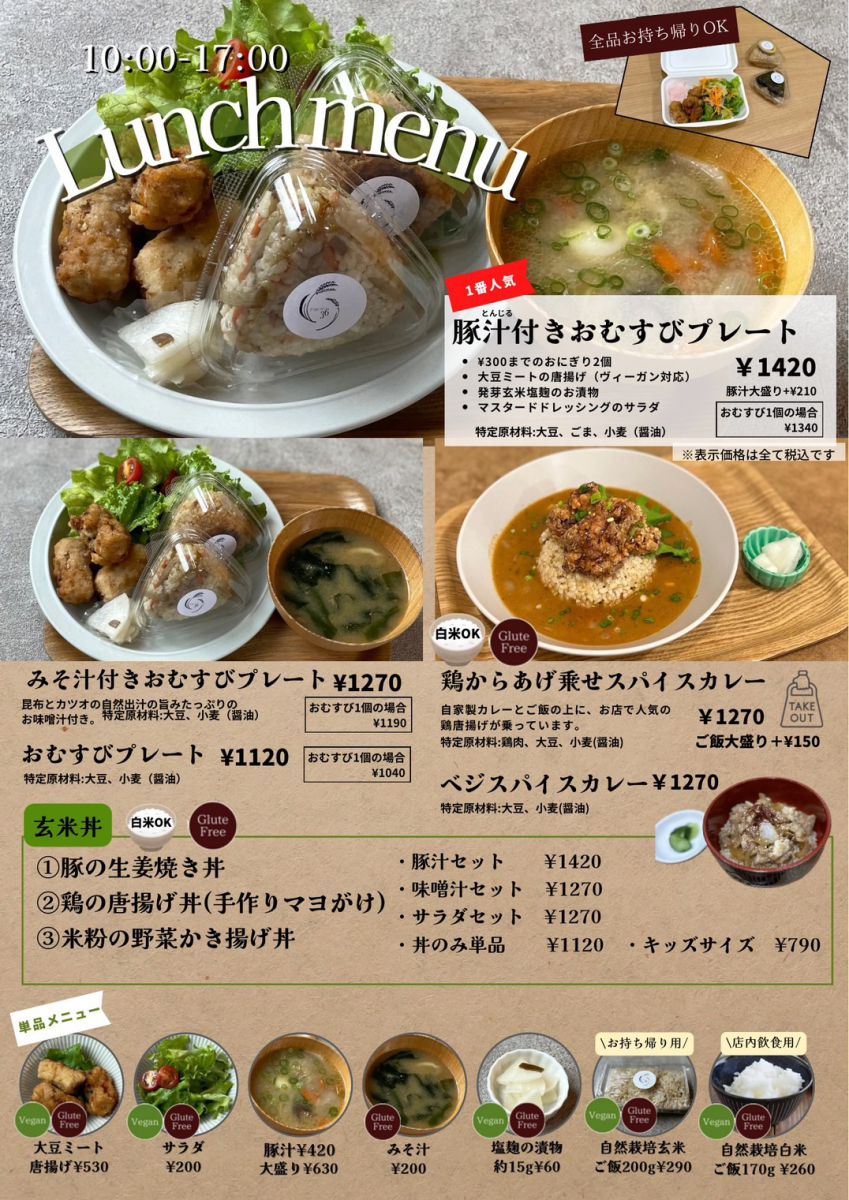 おにぎりや、大豆ミートの唐揚げ、セットのおにぎりプレートなどを提供します。
